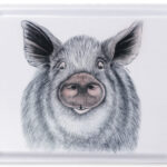 Een Dienblad met de afbeelding van een hilarisch varken “Oscar”. Een serveerblad van Charlotte Nicolin. Een kunstenares uit Zweden.