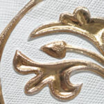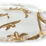 Helder glas mond geblazen met gouden decoratie er in geperst.