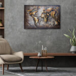 Een prachtig metalen schilderij van de wereldkaart. Gouden uitstraling. Perfect voor in een ‘Hotel Chique‘ interieur.