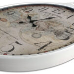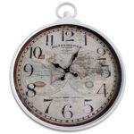 Een grote Metalen Wandklok met een doorsnede van 67cm. Op de wijzerplaat een nostalgische wereldkaart. De kast van de klok is vintage wit.