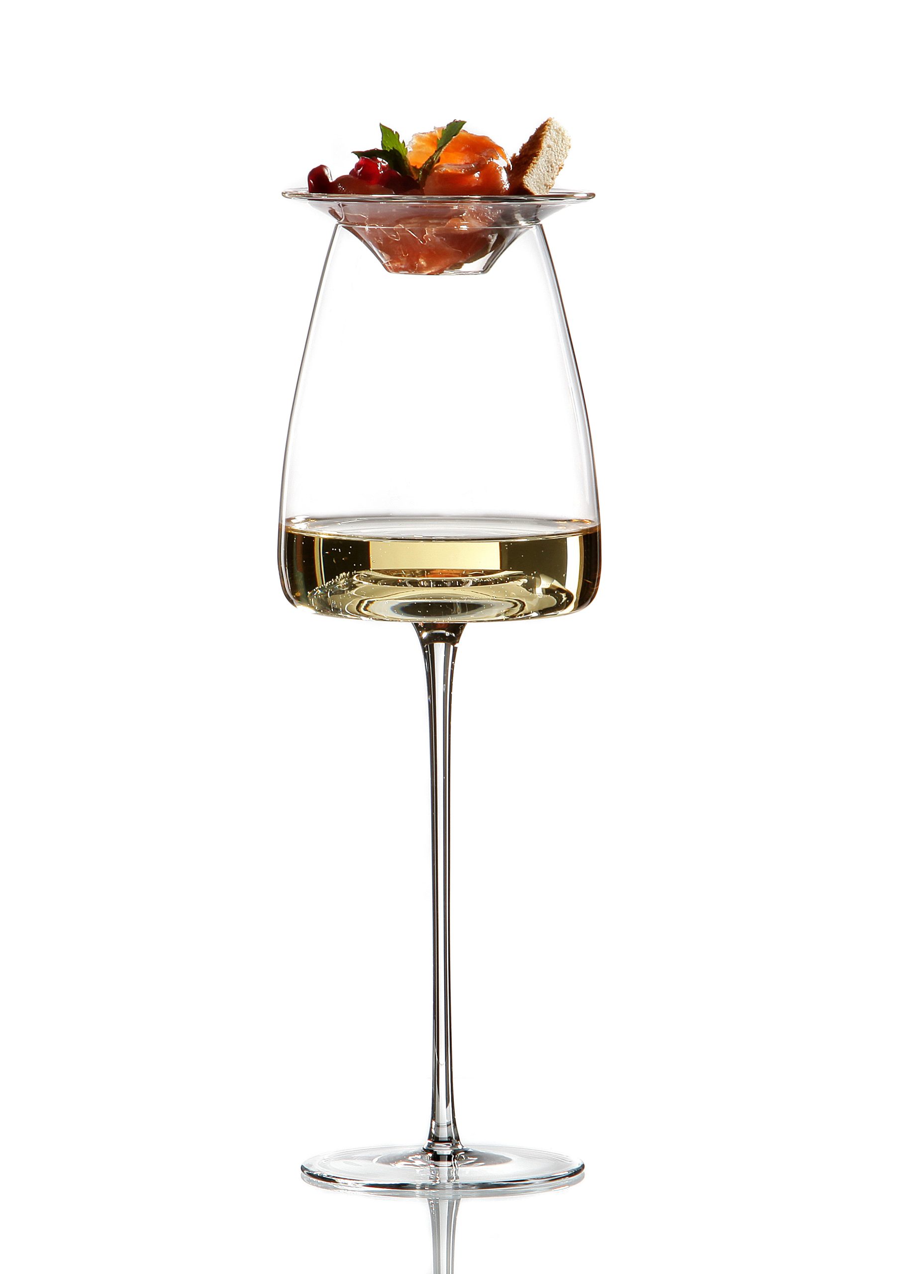 Dit amuseschaaltje, onderdeel van de Tesoro Set2, fungeert als een dekseltje voor op het wijnglas en biedt een stijlvolle manier om amuses te presenteren, terwijl het tevens de aroma’s in het glas behoudt.
