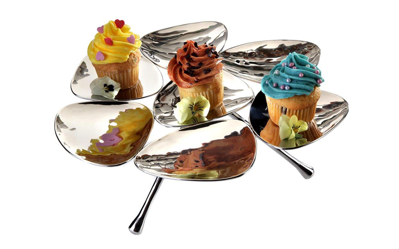 Een prachtige 1 laags etagère van RVS gepolijst. Het is een serveerschaal van Zieher. Zeven blaadjes vormen samen de schaal.