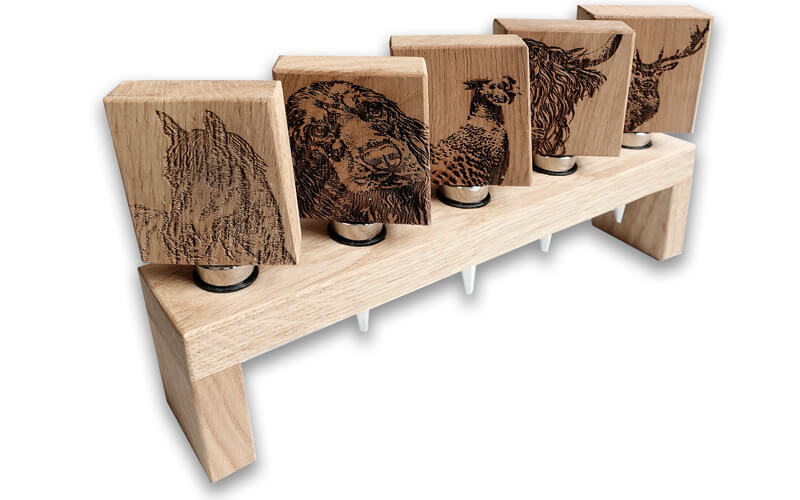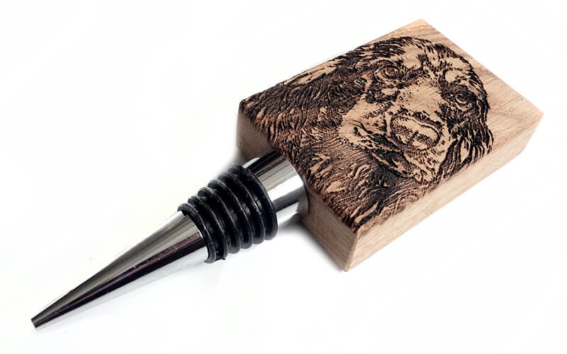 Voor de echte hondenliefhebber: een stijlvolle flessenstop met de afbeelding van een Cocker-Spaniel, prachtig gebrand in massief eikenhout. Deze flessenstop combineert charme en functionaliteit in één bijzonder accessoire.