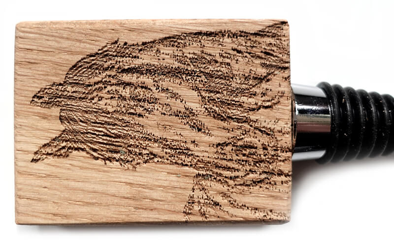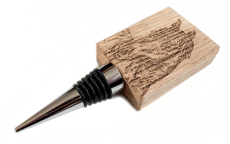 Voor de paardenliefhebber die oog heeft voor detail: deze elegante flessenstop is gemaakt van massief eikenhout en voorzien van een met zorg gebrande afbeelding van een paardenhoofd. De natuurlijke uitstraling van het hout in combinatie met het fijne lijnenspel van de gravure maakt dit een uniek en sfeervol accessoire.