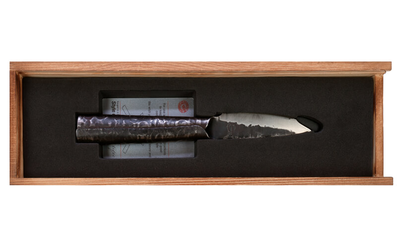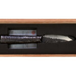 De messen hebben een lemmetdikte van 2 mm en een snijhoek van 18 graden. Verpakt in een luxe houten kistje en met een garantie van 10 jaar.