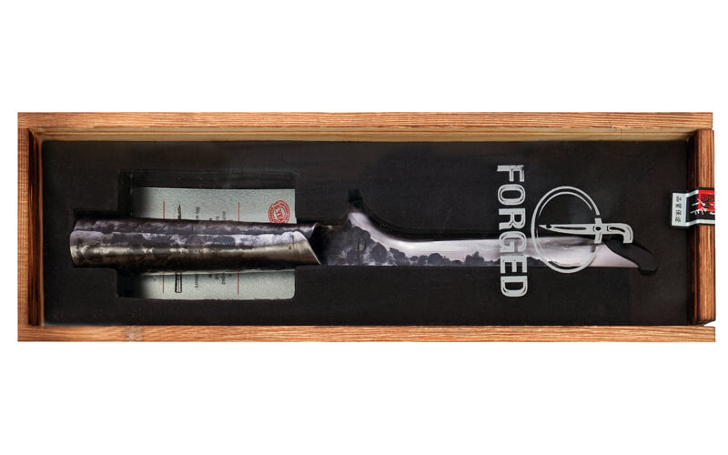 Alle Forged messen zijn met de hand gesmeed, hebben een lemmetdikte van 2 mm en een snijhoek van 18 graden. Bovendien is het verpakt in een luxe houten kistje..