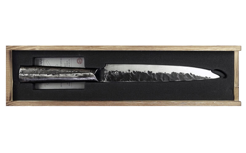 Elk mes in deze serie wordt met de hand gesmeed en is daardoor uniek. Het wordt geleverd in een luxe houten kist en heeft een garantie van 10 jaar.