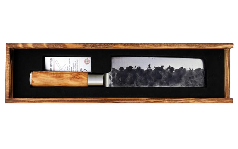 De Forged Olive messen zijn vervaardigd van Japans 440C staal met een hardheid van 58 Rockwell. Alle Forged messen zijn met de hand gesmeed, wat elk exemplaar uniek maakt. De messen hebben een lemmetdikte van 2 mm en een snijhoek van 18 graden. Verpakt in een luxe houten kistje en met een garantie van 10 jaar.