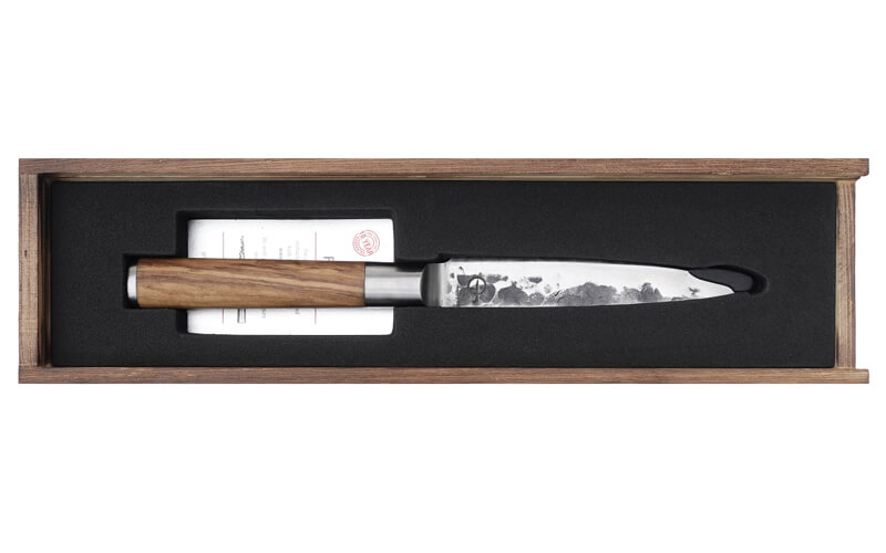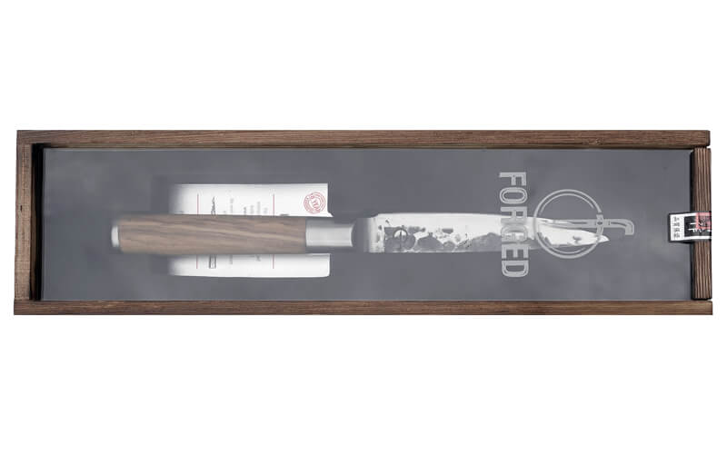 Alle Forged messen zijn met de hand gesmeed, hebben een lemmetdikte van 2 mm en een snijhoek van 18 graden. Verpakt in een luxe houten kistje. Met een garantie van 10 jaar.