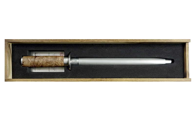 Het VG10 diamanten aanzetstaal zorgt ervoor dat de bramen op het snijvlak weer in de richting van het snijvlak staan, waardoor het mes scherp blijft. Door het mes een aantal keer met het hele lemmet langs het aanzetstaal te halen, maak je je mes na gebruik weer scherp. Belangrijk is om het mes steeds onder dezelfde hoek te houden. Het aanzetstaal zit verpakt in een luxe houten kistje. Op dit product krijg je 2 jaar garantie.