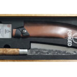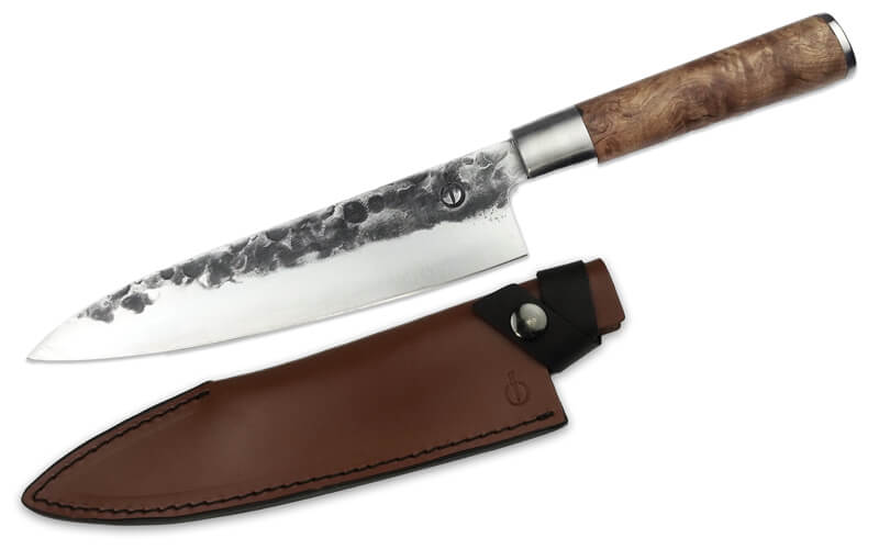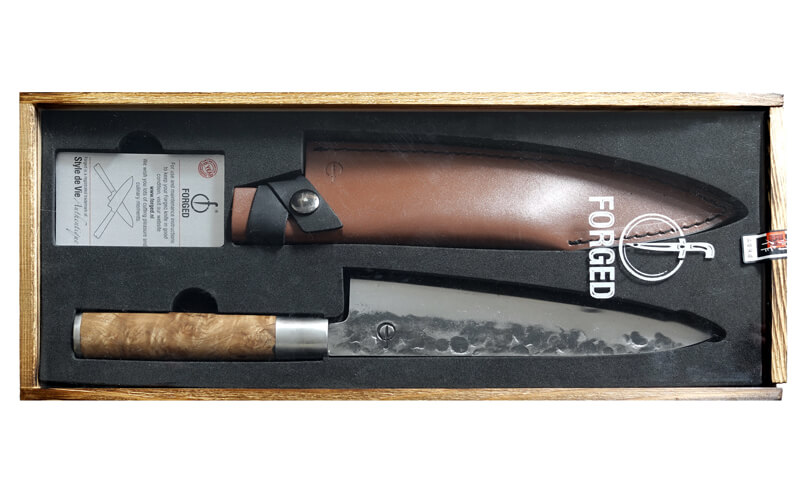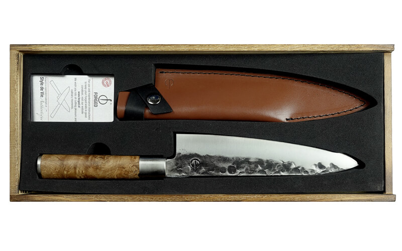 Een prachtig Forged VG10 staal koksmes, met een handvat van wortelhout en een leren messchede (beschermhoes). Het wordt gepresenteerd in een houten kistje. Must have voor in de keuken.