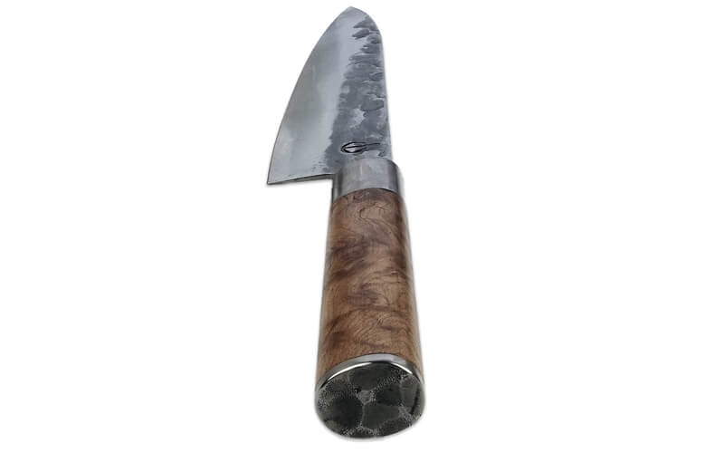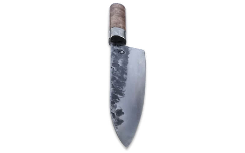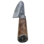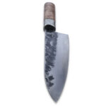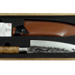 Ontdek het koksmes met een handvat van wortelhout, verpakt in een stijlvol houten kistje, compleet met een leren messchede. Het mes is vervaardigd met behulp van VG10, een roestvaste staalsoort met een opmerkelijk hoog koolstofpercentage van 1%, waardoor het harder is dan de meeste roestvaste staalsoorten.