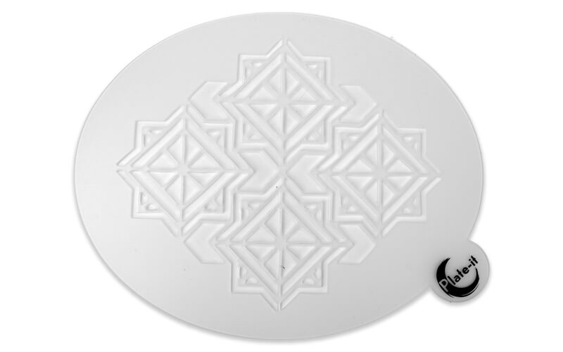 Leg het stencil op het bord. Strooi er met behulp van de Plate-it decoratiezeef een droog ingrediënt (bijvoorbeeld poeder of kruiden) overheen. Til het stencil voorzichtig op met behulp van het lipje. De vorm wordt op het bord zichtbaar. Gevorderde koks kunnen dit stencil ook gebruiken om met puree de vormen ook op het bod te maken. Verdeel de puree in het stencil met een Plate-it knikspalel en verwijder het voorzichtig.