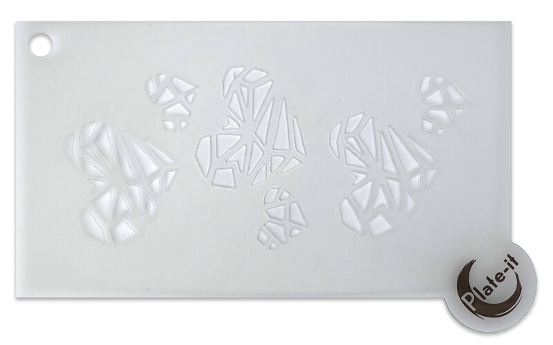 Leg het stencil op het bord. Strooi er met behulp van de Plate-it decoratiezeef een droog ingrediënt (bijvoorbeeld poeder of kruiden) overheen. Til het stencil voorzichtig op met behulp van het lipje. De vorm wordt op het bord zichtbaar. Gevorderde koks kunnen dit stencil ook gebruiken om met puree de vormen ook op het bod te maken. Verdeel de puree in het stencil met een Plate-it knikspalel en verwijder het voorzichtig.