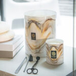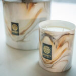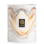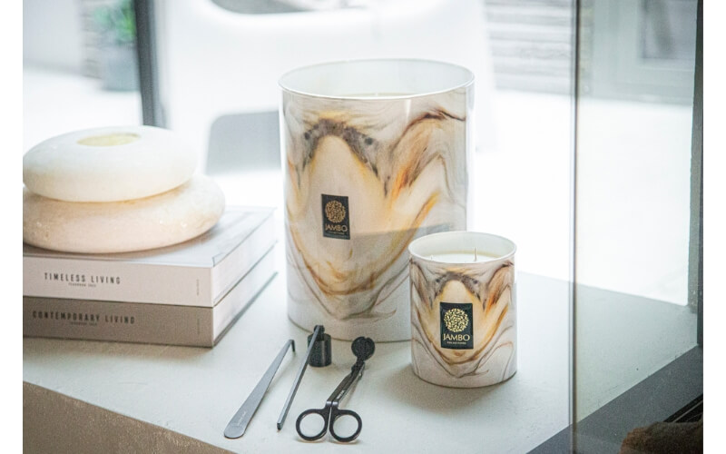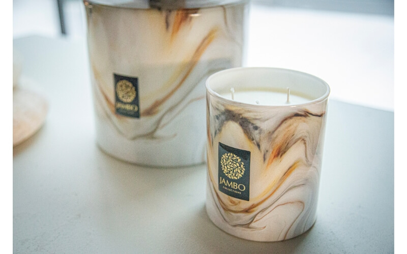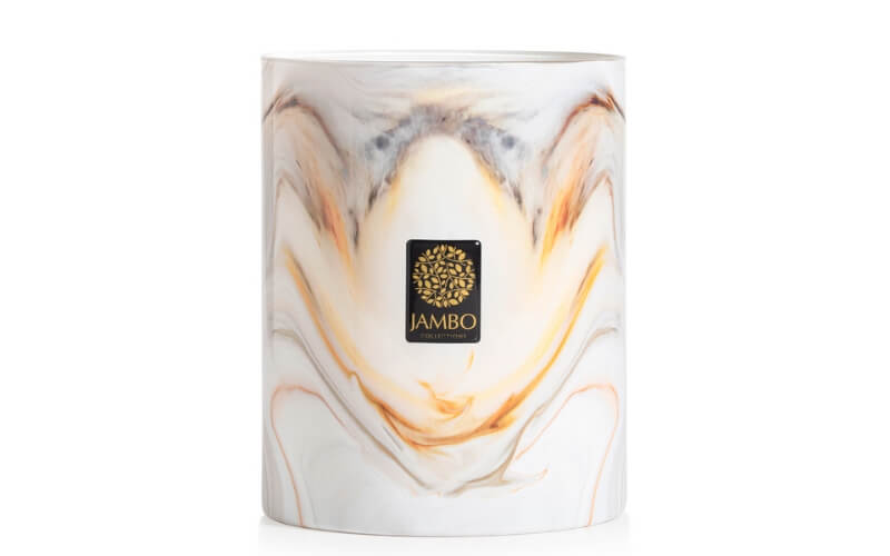 De glazen vaas waarin de geurkaars in zit heeft een marmeren uiterlijk en Jambo maakt gebruik van Italiaans designglas.