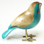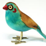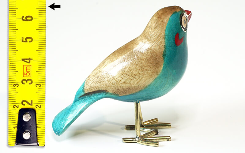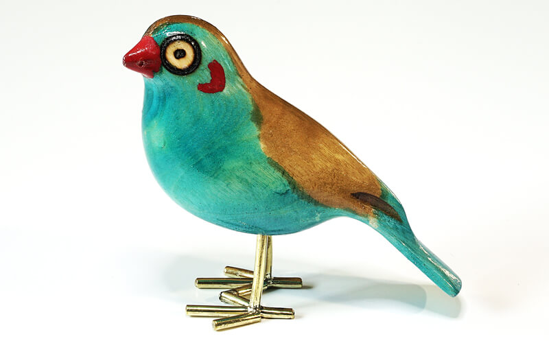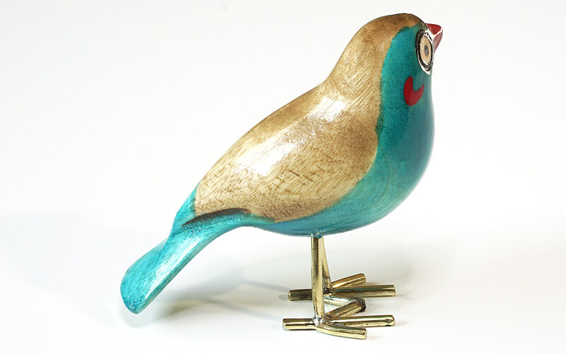 De vogeltjes zijn uit palissanderhout van de Jacaranda boom gesneden en met de hand geschilderd. De pootjes zijn van gerecycled messing.