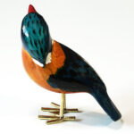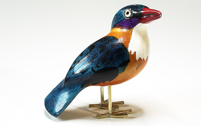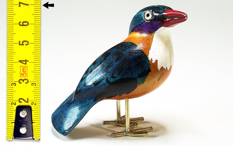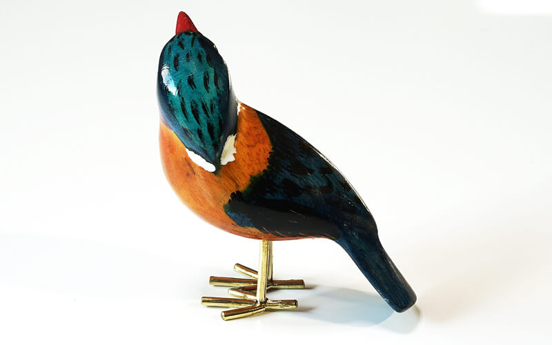 De vogeltjes zijn uit palissanderhout van de Jacaranda boom gesneden en met de hand geschilderd. De pootjes zijn van gerecycled messing.
