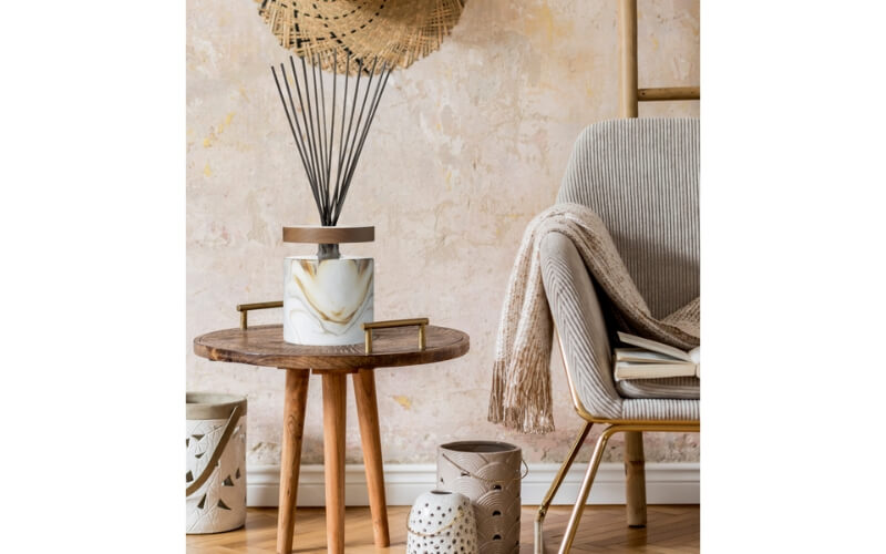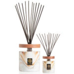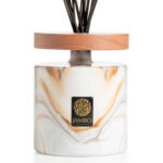 Ontdek de weelde en luxe van deze indrukwekkende diffuser, gepresenteerd in een wit marmer glazen fles met subtiel Italiaans design en bekroond met een massief houten deksel.