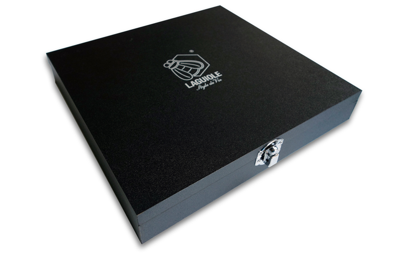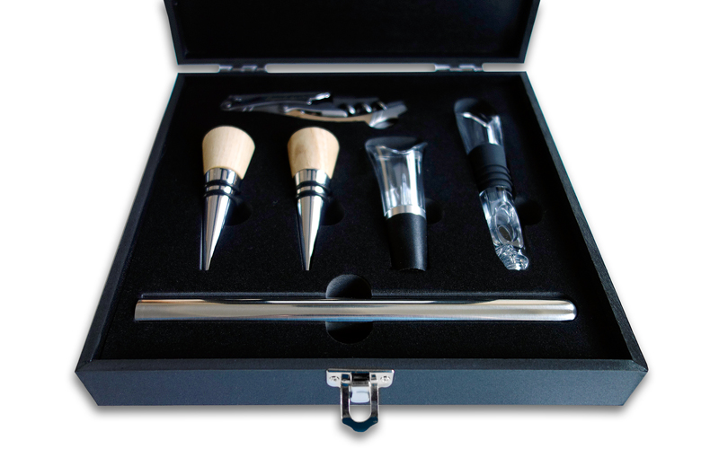 Alle wijnaccessoires worden geleverd in een stijlvol houten zwart kistje, wat een luxe bewaarplek biedt.