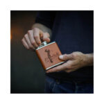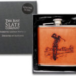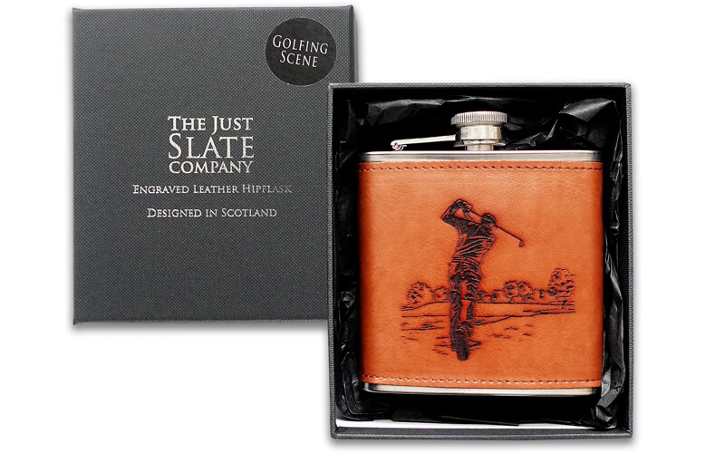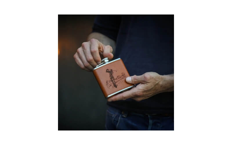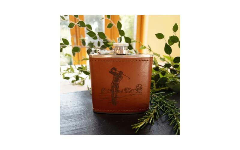 Een stoer heupflacon van RVS en echt leer, met een afbeelding van een Golfer van het merk The Just Slate Company. Een mooi cadeau om te geven, maar zeker ook om te krijgen.