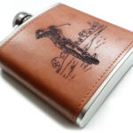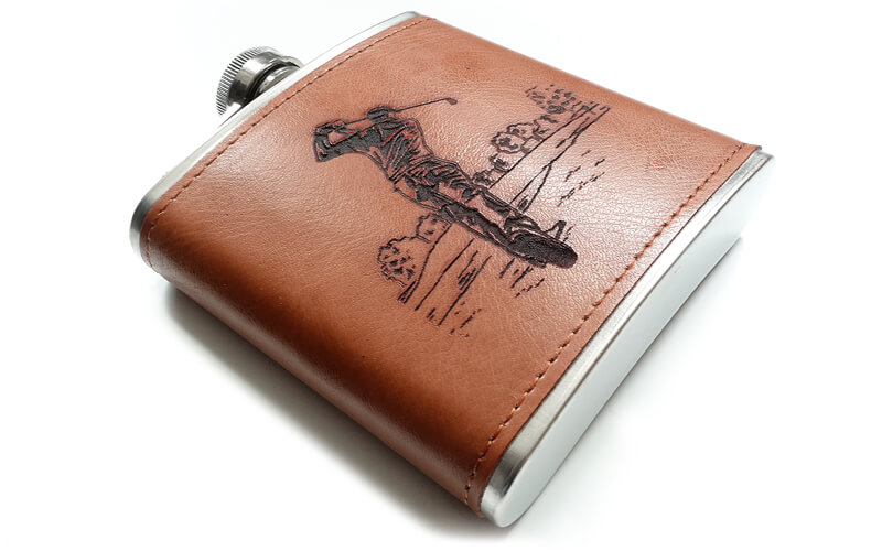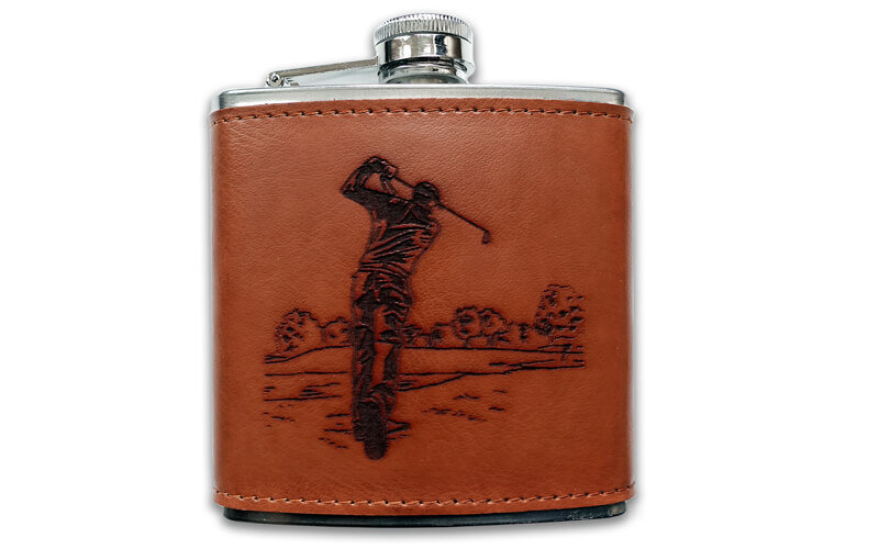 Leren heupfles Golf is een van de heupflessen uit de collectie Classic British Sports. Een RVS, handgemaakt leren hip flask, met een afbeelding van een golfer op de voorkant.