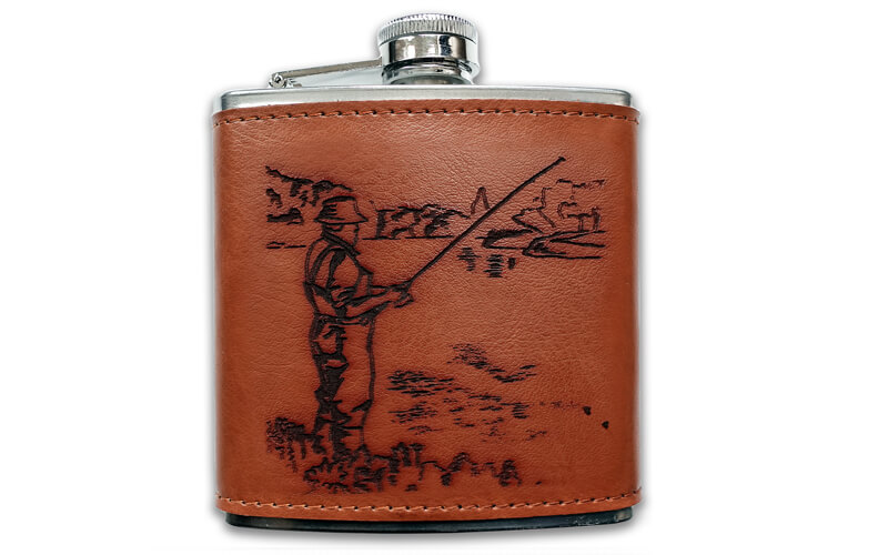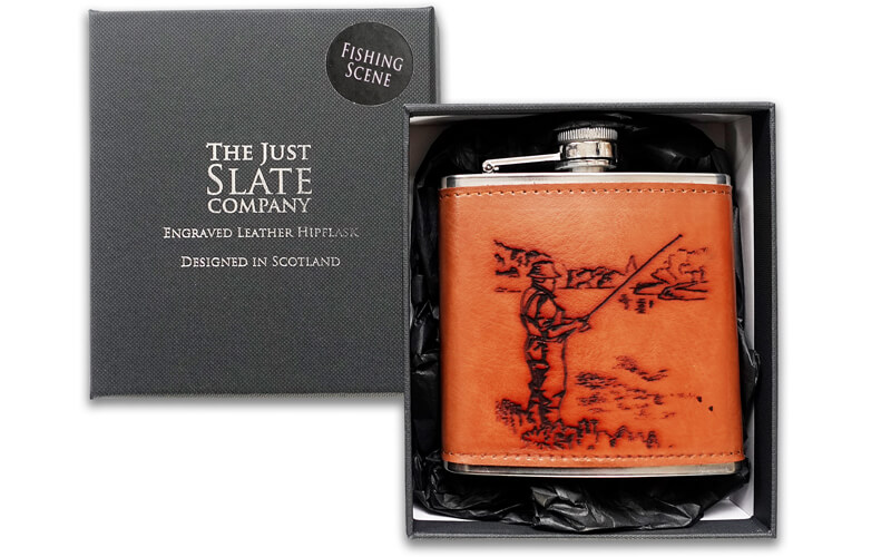 Een stoer heupflacon van RVS en echt leer, met een afbeelding van een visser van het merk The Just Slate Company. Een mooi cadeau om te geven, maar zeker ook om te krijgen.