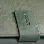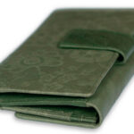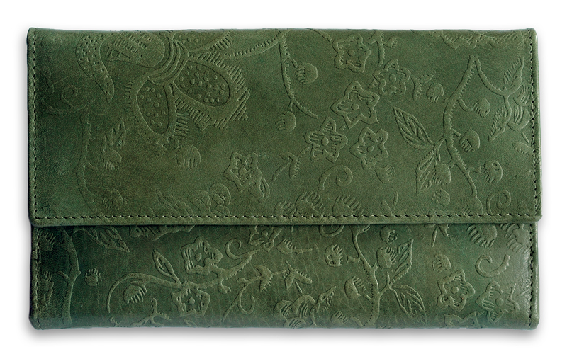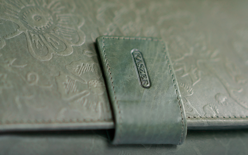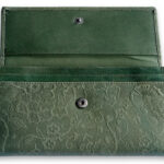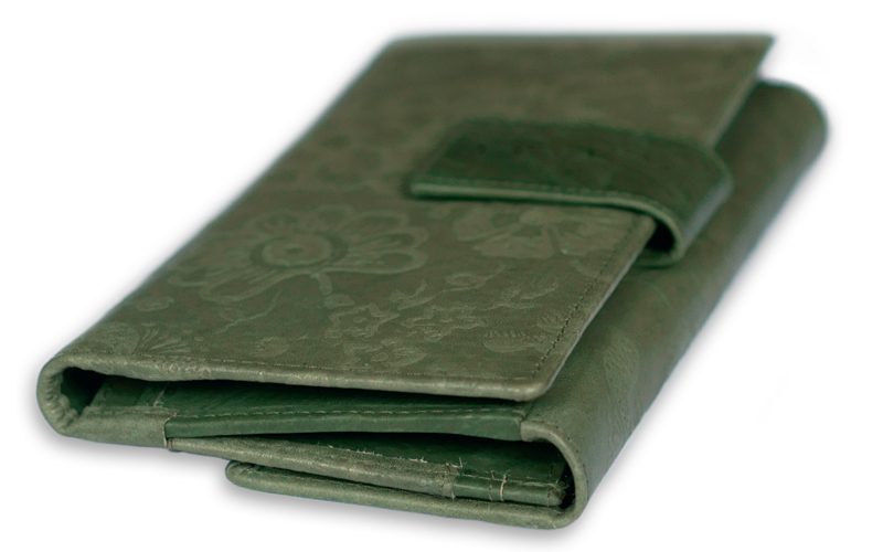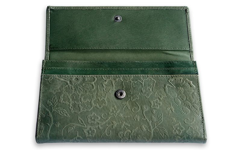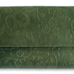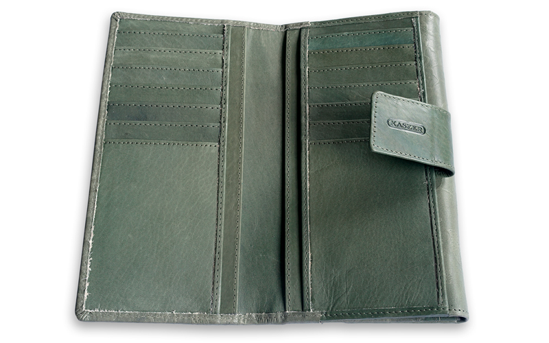 Een portemonnee van groen gekleurd leer met een bloemmotief gestanst patroon. De portefeuille bezit een aantal vakken en is van het merk Kaszer welke garant staat voor kwaliteit.