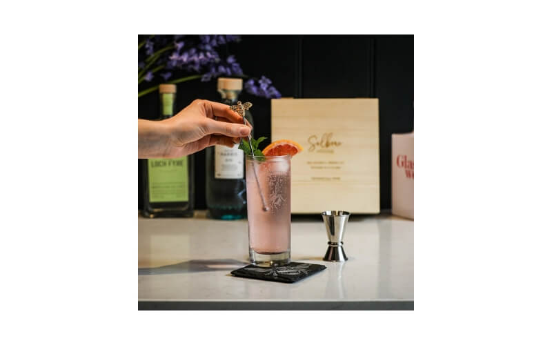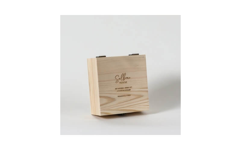 De set wordt geleverd in een luxe houten Selbrae House geschenkdoos, waardoor het een bijzonder cadeau is voor liefhebbers van natuur, design en stijlvolle drankmomenten.