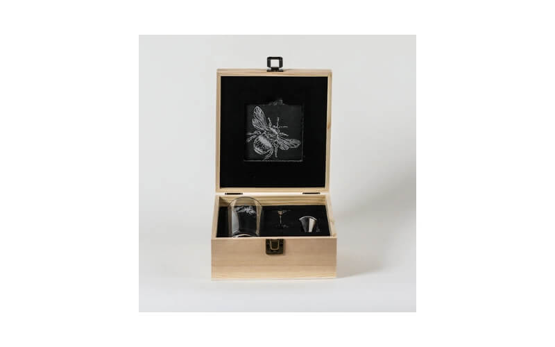 Luxe longdrink set Bee van Selbrae House met highball glas, leisteen onderzetter, roerstaafje en maatje. Verpakt in houten giftbox. Shop Kadeloo.nl.