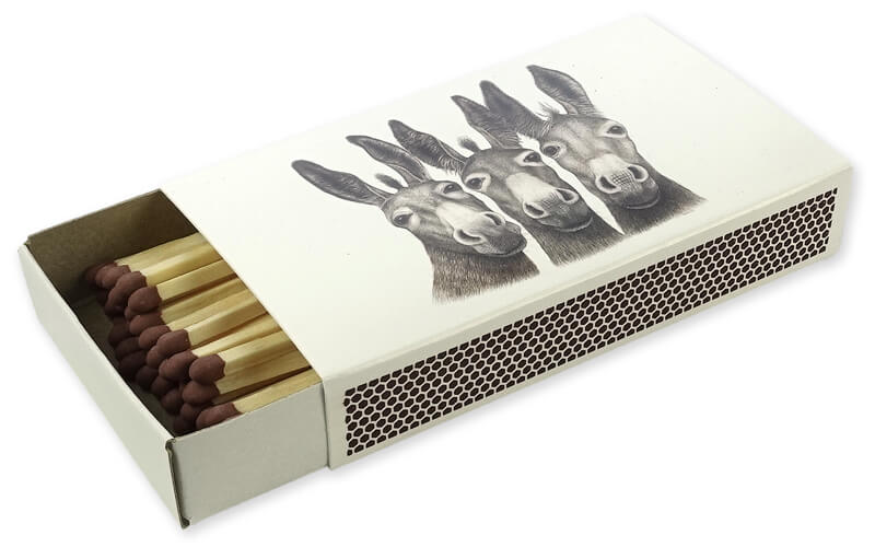 In deze luciferdoosjes zitten 45 extra lange veiligheidslucifers die meerdere kaarsjes in één keer kunnen aansteken. Op dit doosje staan de drie ezels Amigo’s.
