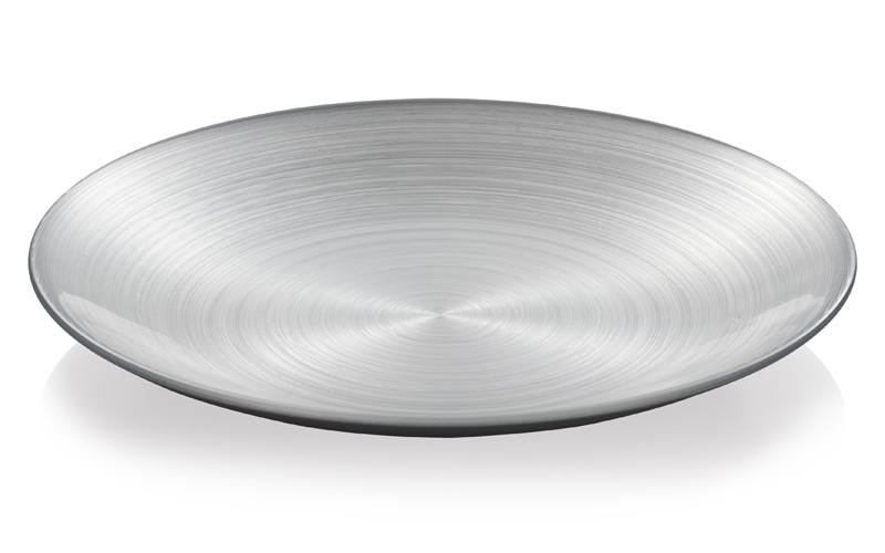 Een luxe serveerschaal platina (zilver kleurig) met een doorsnede van 53 cm. Een zeer decoratieve schaal van een hoge kwaliteit mond geblazen glas uit de serie Bombay van IVV. Een eyecatcher voor in elk interieur.