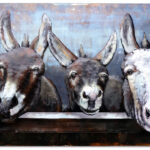 Een zeer decoratief schilderij van metaal met drie ezeltjes als decor. Een kleurrijk schilderij welk past in een eigentijds interieur.