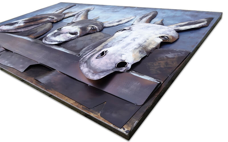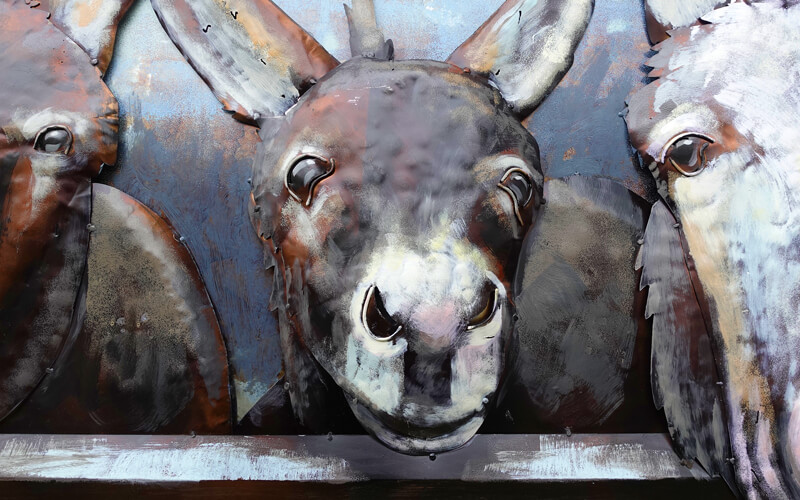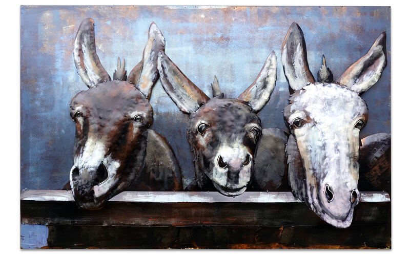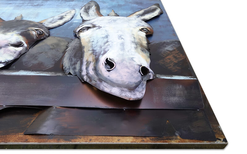 Ontdek ons prachtige Metalen Schilderij 3D Ezels, een meesterwerk in metaal.