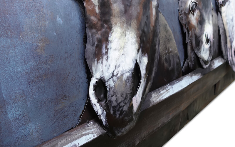 Dit schilderij is volledig vervaardigd uit metaal en wordt in een fascinerende driedimensionale stijl weergegeven. De ezeltjes zijn uit het metaal gestanst, en de contouren zijn zorgvuldig op de metalen achtergrond gelast.