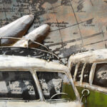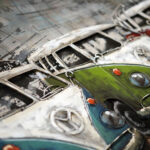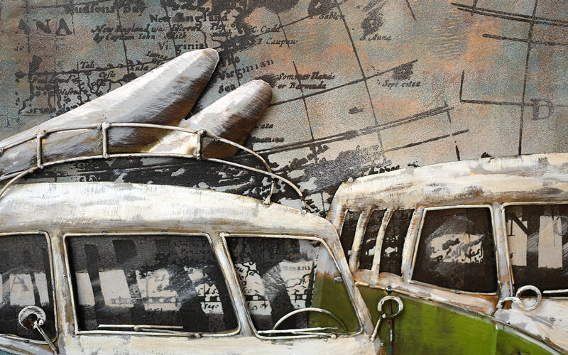 Dit schilderij is volledig vervaardigd uit metaal en wordt in een fascinerende driedimensionale stijl weergegeven. De bestelbusjes zijn uit het metaal gestanst, en de contouren zijn zorgvuldig op de metalen achtergrond gelast.