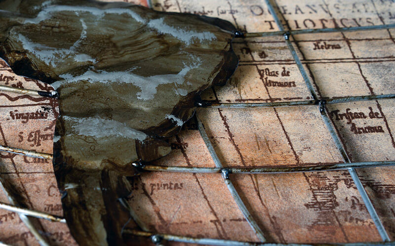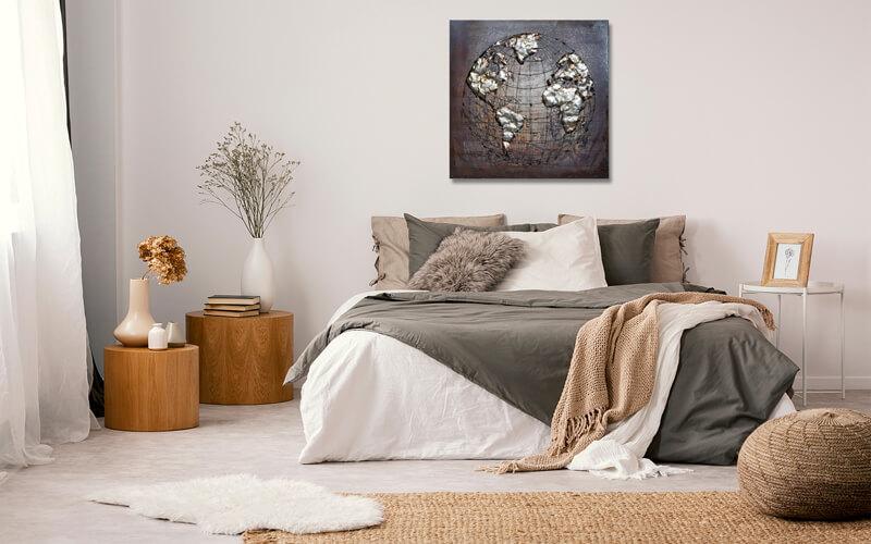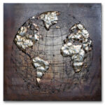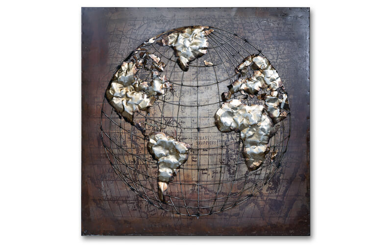Een prachtig metalen schilderij. Een stukje metal art van een wereldbol geheel in 3D. Dit is een echte eyecatcher voor in elk interieur.