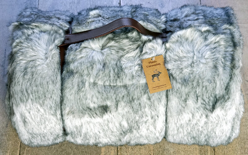 Ons assortiment plaids in imitatiebont wordt gepresenteerd in halfleren banden. Hierdoor is het als een tas te dragen en makkelijk mee te nemen of in een rol op te bergen.