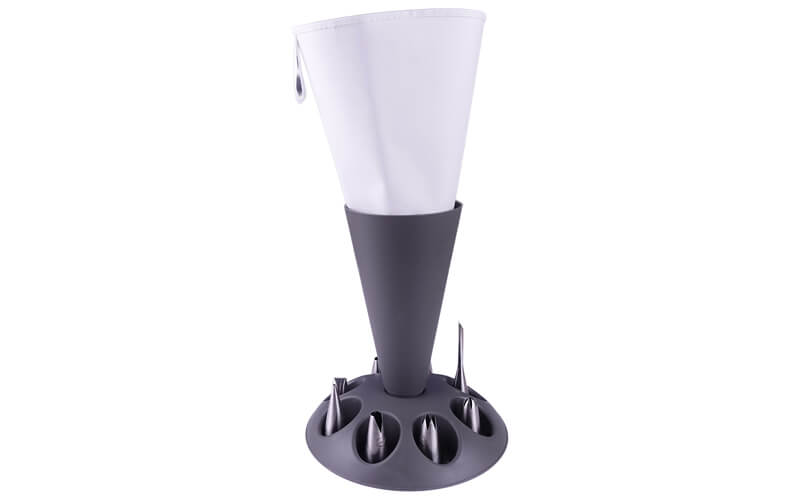 Een super handige keukenhulp is deze Spuitzakhouder incl. accessoires van het merk Plate-it. 1 spuitzakhouder, 2 katoenen spuitzakken en 8 spuitmondjes.
