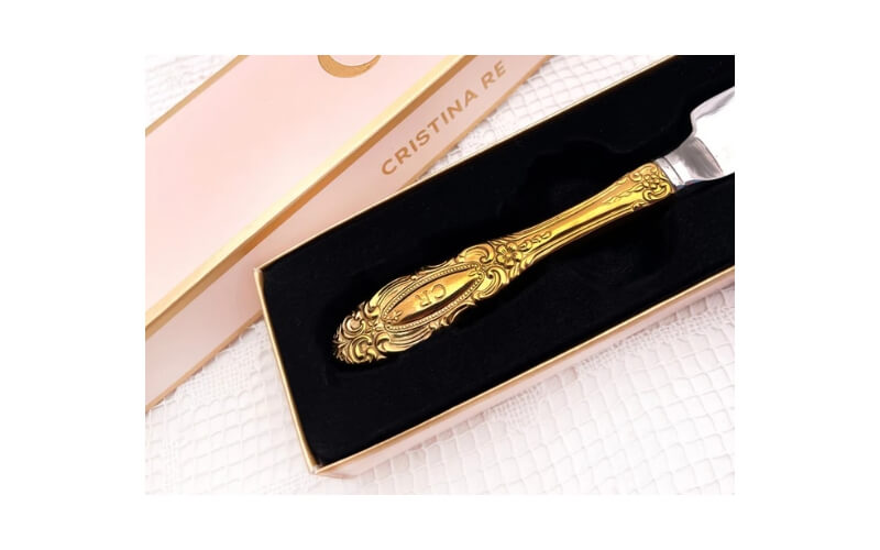 Taart Mes Christina Re. 24 karaat verguld. Het perfecte cadeau voor een bruiloft, doop, vrijgezellenfeest of verjaardag of zelfs een cadeau dat je aan jezelf geeft.