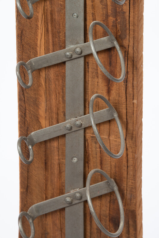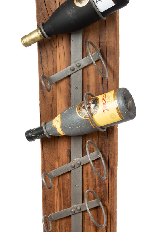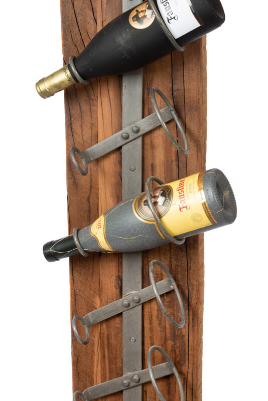 Indien u slechts één of twee flessen heeft, maak gebruik van de onderste beugels om het evenwicht te bewaren. Het gerecyclede teakhout en het metalen ontwerp stralen duurzaamheid uit.