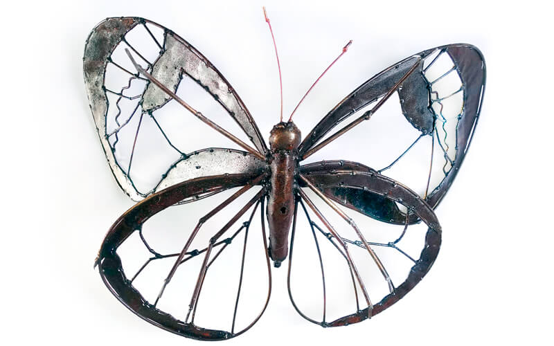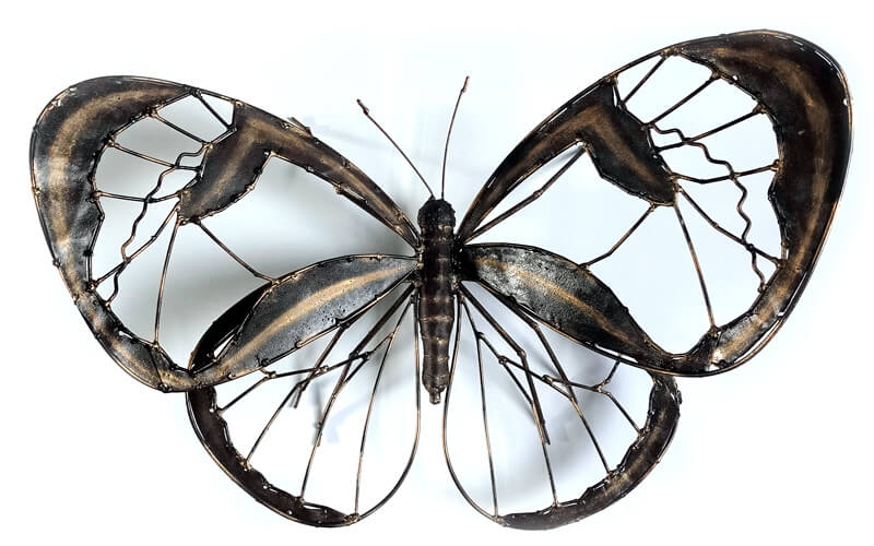 Handgemaakte metalen grote vlinder als decoratie voor in huis of in de tuin. Dit mega grootte insect wordt gemaakt in een klein dorpje in Zimbabwe. De firma Arresoir & Persil uit Frankrijk laat hier van oud metaal objecten maken voor een eerlijke prijs wat bij ons bekend is als Fair Trade. De Franse firma is ook gecertificeerd Fair Trade leverancier.