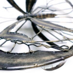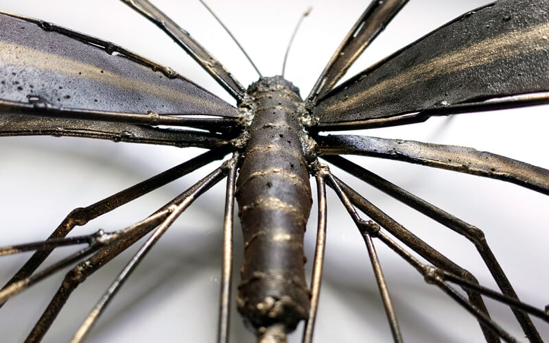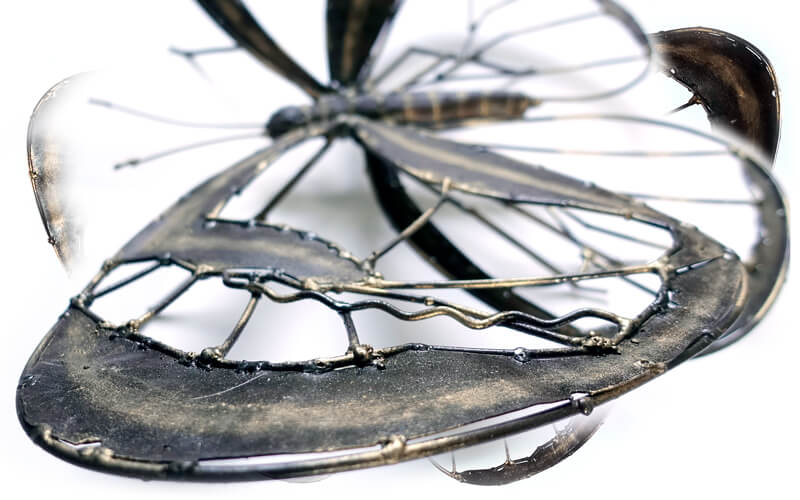Een mega grote vlinder van metaal en door de verschillende technieken die gebruikt zijn met het metaal heeft het een wonderlijke structuur met veel aspecten van kleur en schaduwen.