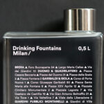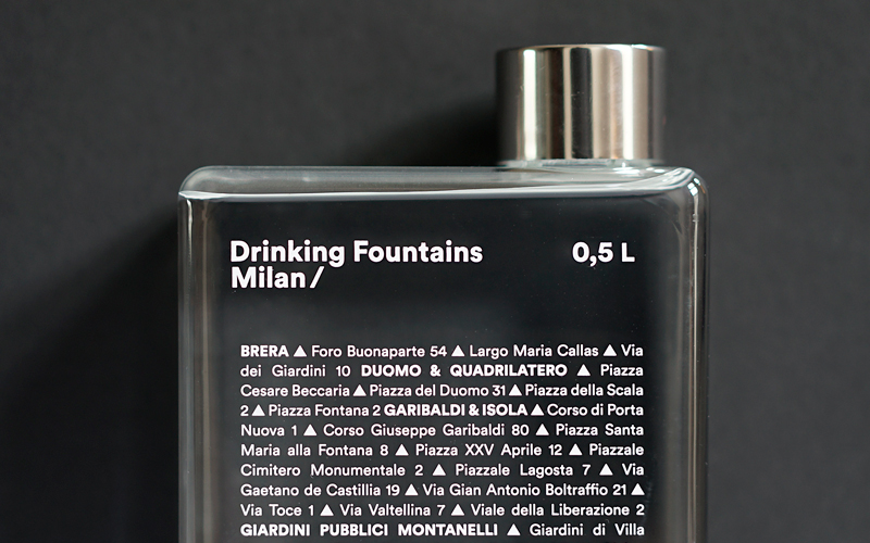 Een fles van gerecycled plastic met diverse watertap punten kris kras door de wereld steden. Deze hervulbare waterfles is gemaakt voor Milaan.