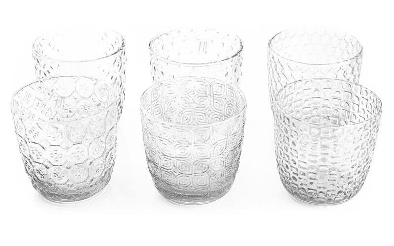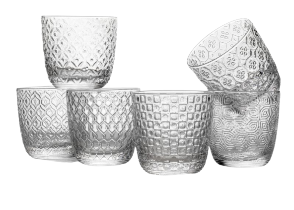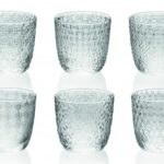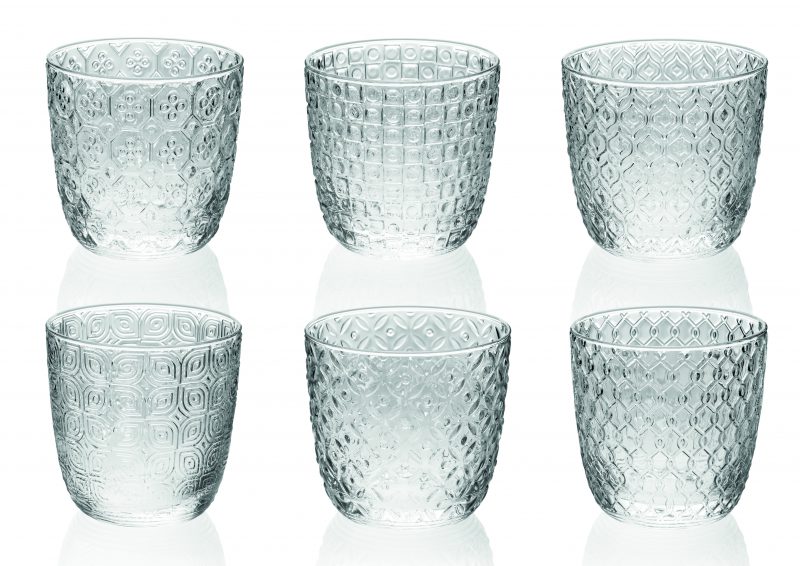 Set van zes prachtige waterglazen met zes verschillende designs uit de collecties Sixties van IVV. Italiaans handgeblazen glaswerk in de kleur transparant.
