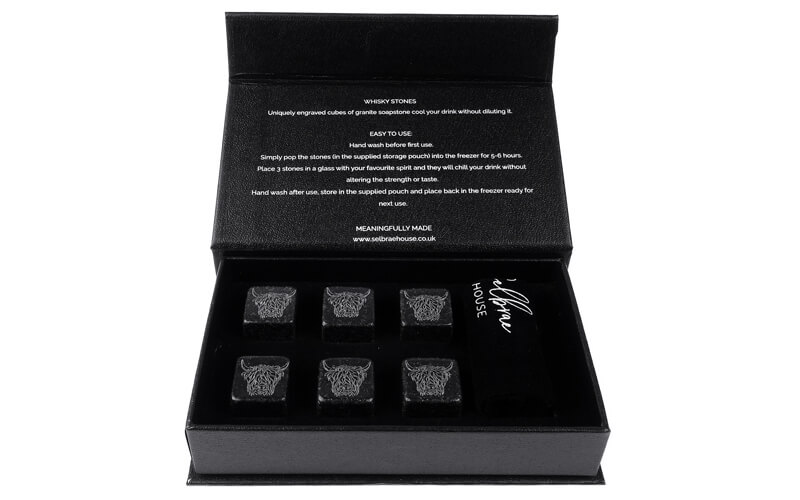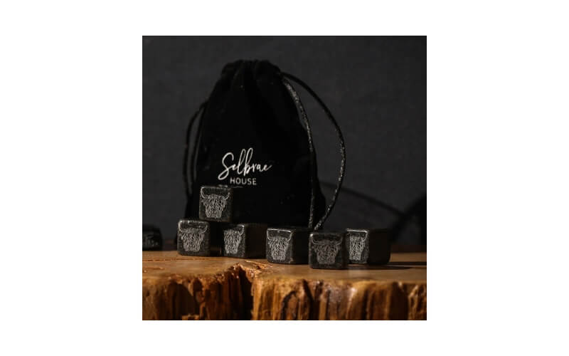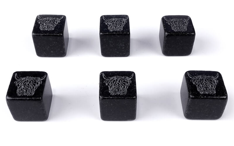 Een set van 6 whiskystenen wordt compleet geleverd met een fluwelen opbergzakje en geschenkverpakking. Whisky IJsblokjes Schotse Hooglander.