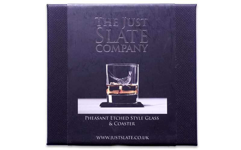Een elegant Whiskyglas met Onderzetter, met een prachtige fazantdecoratie. Verpakt in een geschenkdoos.