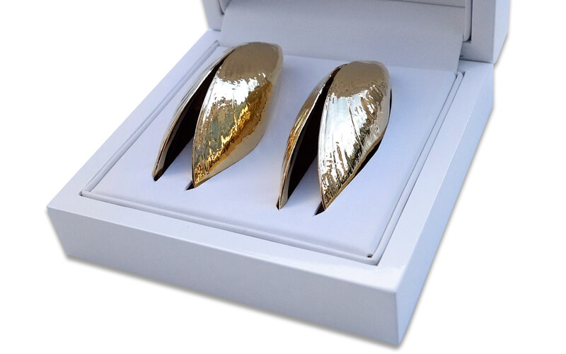 Zij worden per twee stuks aangeboden in een wit hoogglans houten kistje met certificaat van echtheid.