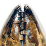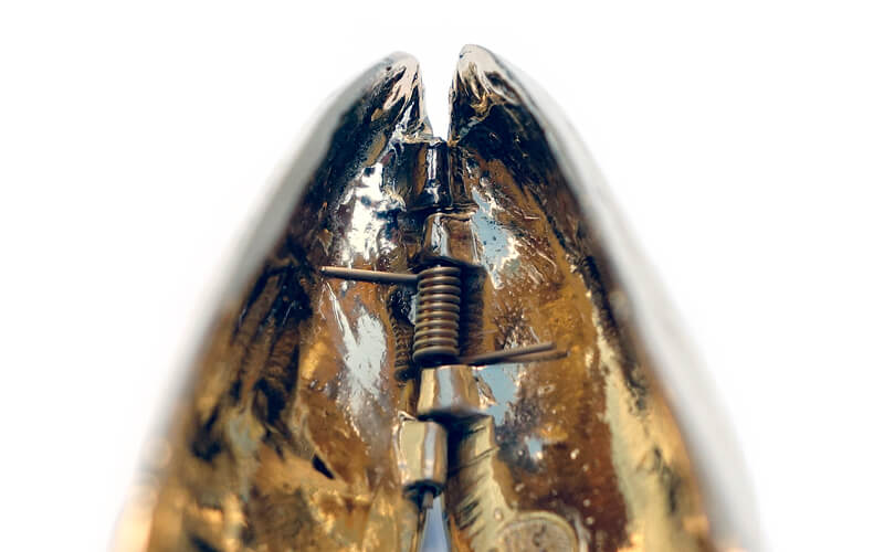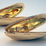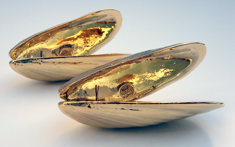 Het vergulde mosselbestek is een zuiver tinnen product en is vervolgens goud verguld.