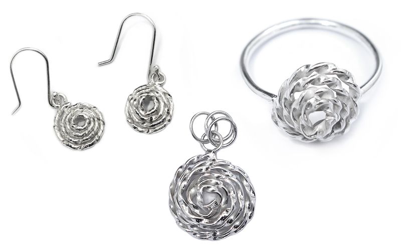 Zilveren sieraden set bestaande uit een ring, oorbellen, een hangertje. De set heet Rosa en is gemaakt in Mexico. Het is een product uit een fair trade programma.